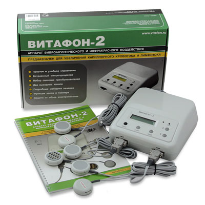 Аппарат комбинирует микровибрационные волны различной частоты и импульсное инфракрасное излучение, создаваемые виброфонами и ИК-излучателем. При раздельном или сочетанном воздействии микровибрации и ИК-излучения ускоряется микроциркуляторный кровоток и лимфатический дренаж, повышается сократимость мышц, улучшается трофика тканей, что в результате приводит к более выраженному терапевтическому эффекту в лечении воспалительных заболеваний и травм, сокращению сроков лечения и профилактике возможных осложнений. Витафон-2 используется в курсе физиотерапевтического, а также курортно-санаторного лечения, в домашних условиях манипуляции производятся по назначению и под контролем врача-специалиста. Давно известно, что такие заболевания, как артроз, аденома простаты, простатит, уретрит, цистит, расстройства в работе кишечника, миалгии и невралгии тесно связаны с нормальным состоянием позвоночника, потому что нервная регуляция всех процессов в организме обеспечивается головным мозгом посредством спинного мозга. Именно для повышения качества жизни и работоспособности, а также для опосредованного улучшения общего состояния организма применяются аппараты Витафон, Витафон-Т, Витафон-2, предназначенные для ежедневного виброакустического массажа кожи и подлежащих тканей на глубину до 10 см. С вибрацией неразрывно связаны нормальные функции организма, в том числе компоненты иммунной защиты, выведение из тканей продуктов жизнедеятельности и умерших клеток. В норме микровибрация обеспечивается сокращениями мышц, но в век гиподинамии организм постоянно испытывает их острый недостаток. Согласно последним исследованиям ученых, нормальная активная жизнь современного человека может быть продлена за счет компенсации недостатка вибрационных возмущений в тканях внешними источниками вибрации. В течение последних 14 лет специалисты различных направлений медицины, в том числе хирургии, травматологии, педиатрии, гинекологии, урологии, подтвердили в своих научных изысканиях большое значение использования внешних источников вибрации для жизненно важных процессов регенерации в организме человека. В данных исследованиях были также использованы аппараты серии «Витафон». Комплект поставки аппарата ВИТАФОН-2: